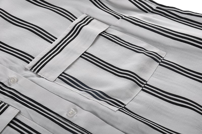 Stripe is always an eternal pattern for shirt. Like this shirt, black triple stripes in white background, two pockets and flaps in chest part. as a basic style,