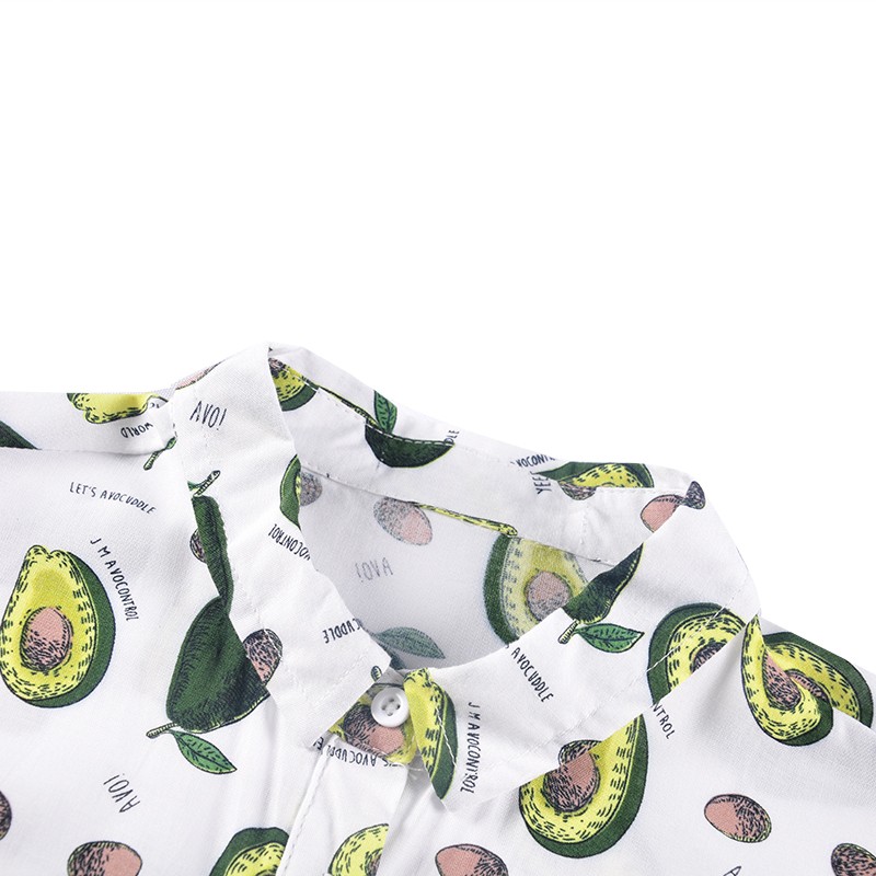 basic viscose roll-up short sleeve shirts,there is a pocket on the left and tie on the bottom,It is white background and avocado printed shirts