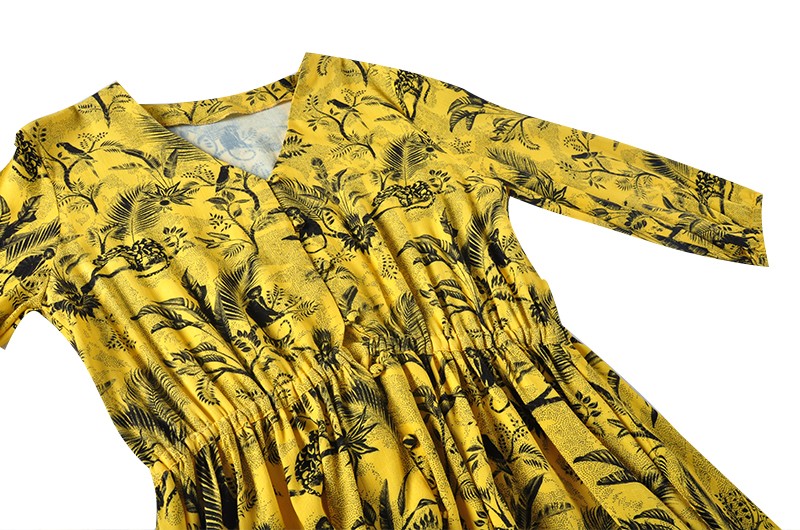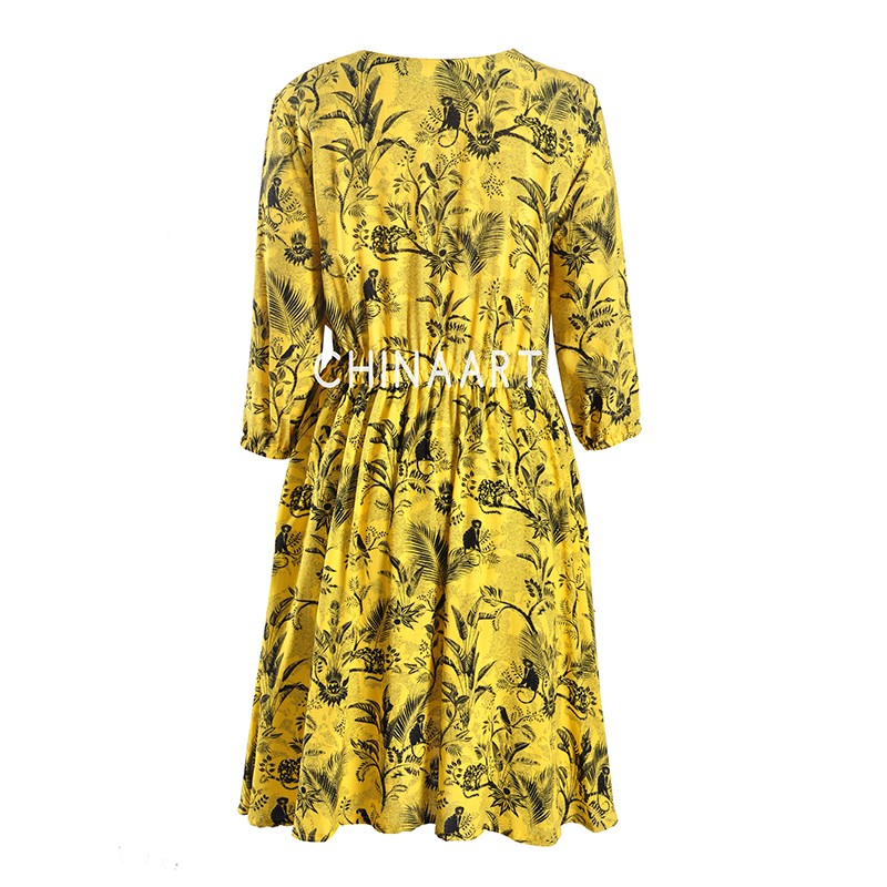 V neck,shank plastic buttons,allover print,3/4 sleeves dress