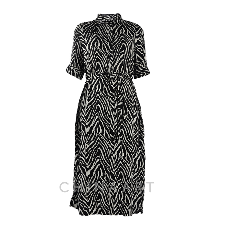 ladies shirt dress,belt at waist,allover print,two pockets at sideseam,long slit at two sides