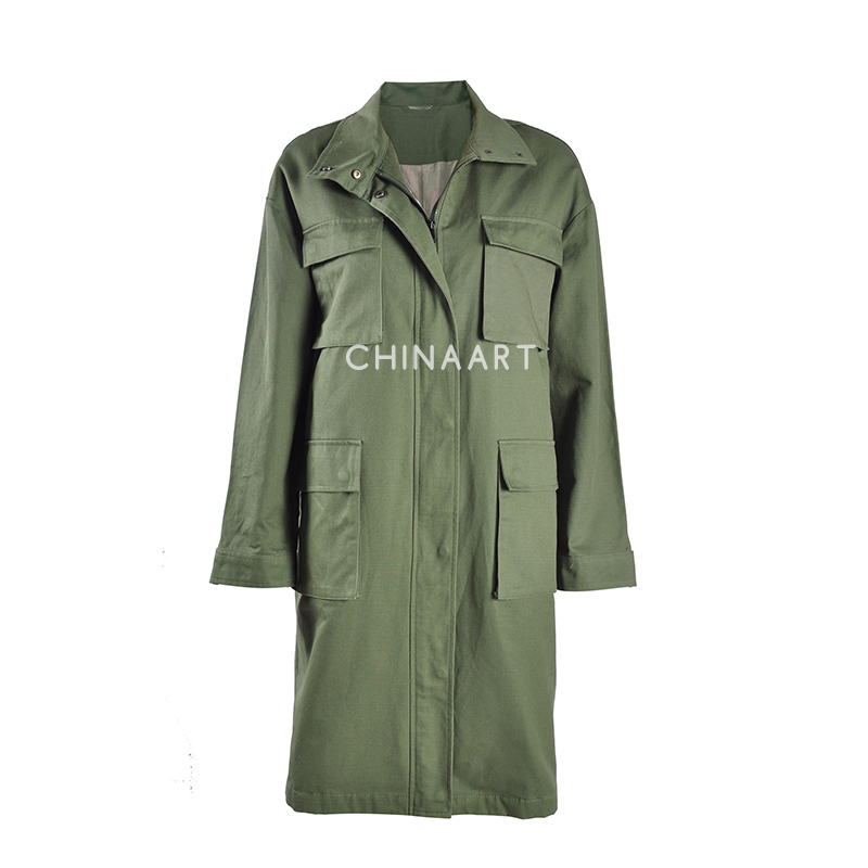 ladies' parka,metal zip and buttons on the front placket,large pockets with flap on the front
