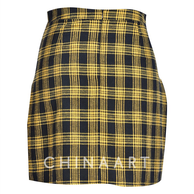 ladies' fashion skirt,yarn-dyed plaid fabric,self fabric sleeve belt,the front fly and sleeve cuff have resin buttons.Invisible zipper on the back